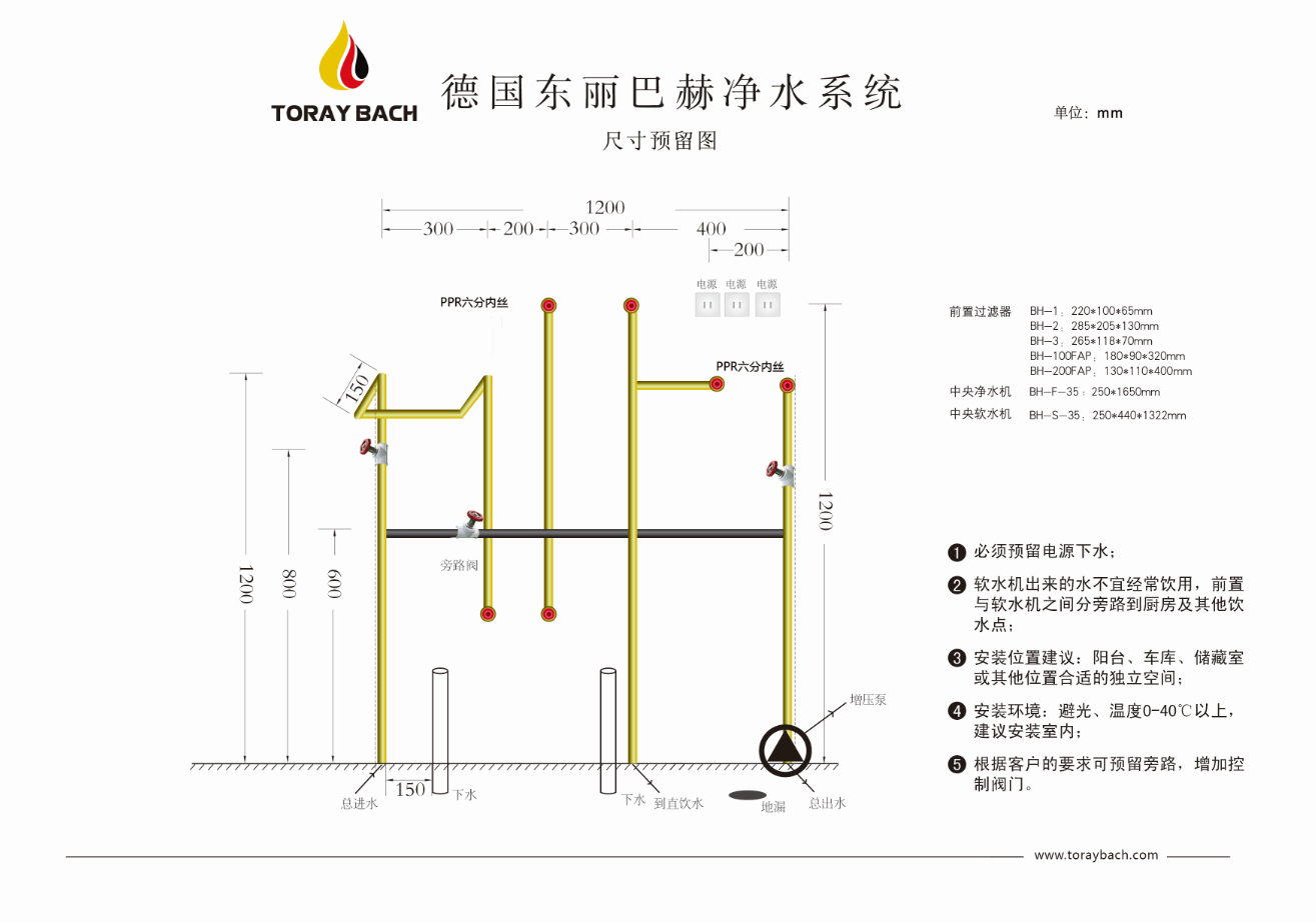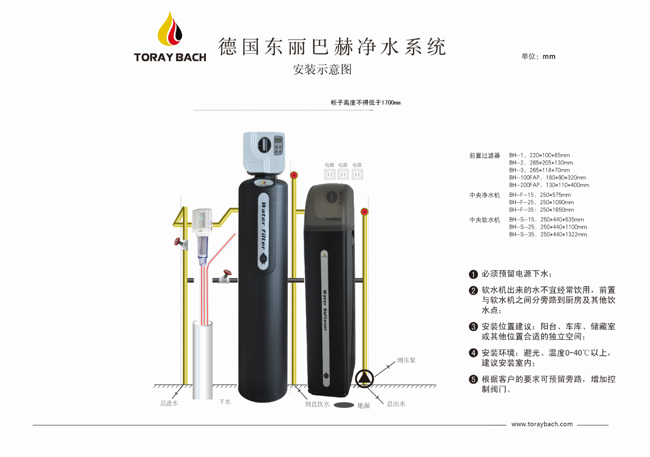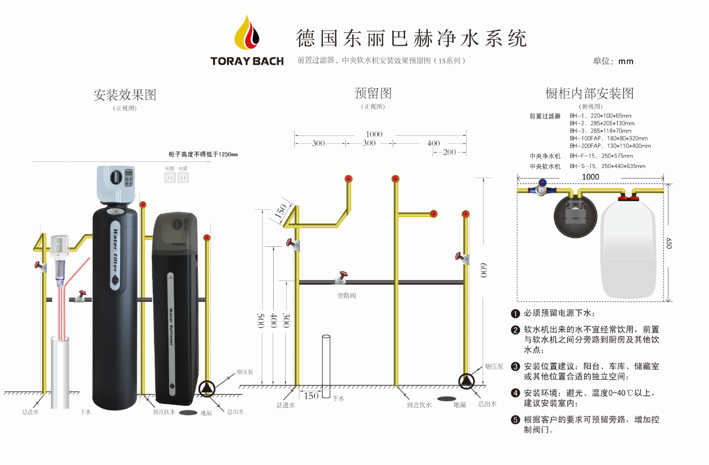 1、为确保东丽巴赫净水机产品满足顾客的使用需求,安装人员应确保净水机的进水水质、进水压力、进水流量、水温等满足产品性能参数表中的要求。