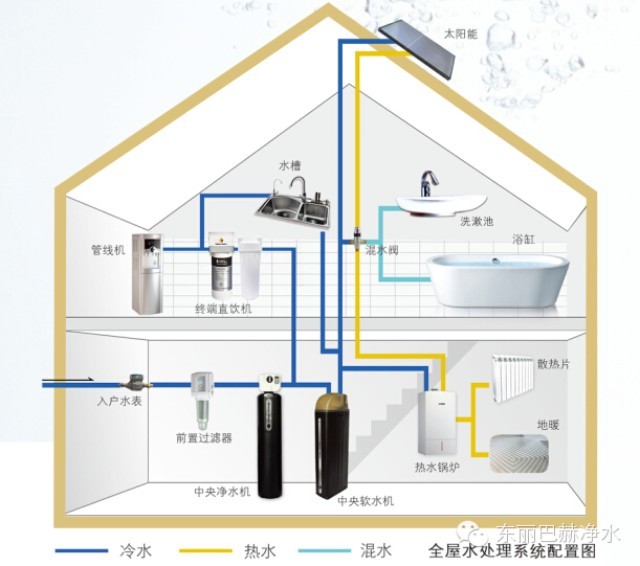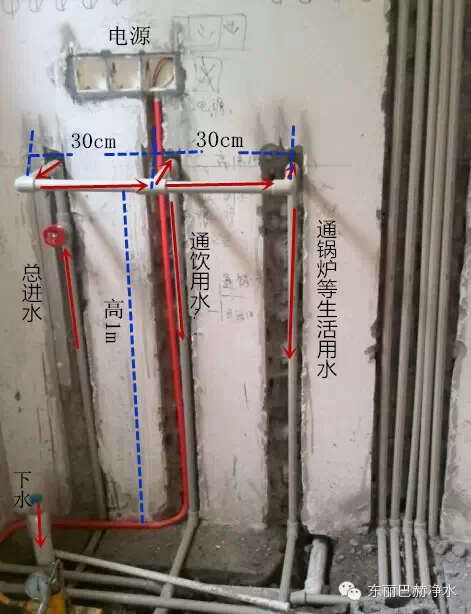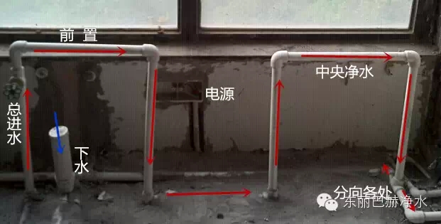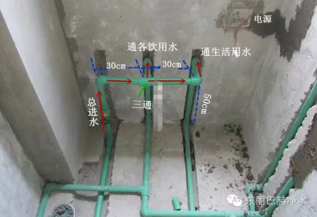 最左边第一根管路是总进水,前置的进水口,在总进水前端预留总阀门; 中间第二根管子是中央净水的出水口,单独通向厨房用水及其他直饮水处; 最右边第三根管子是软水出水口,通向锅炉、卫生间、洗衣房等各生活用水处(除喝的水之外的所有用水)。 三管间距最好30cm,离地成型高度1m,必须预留电源和下水。