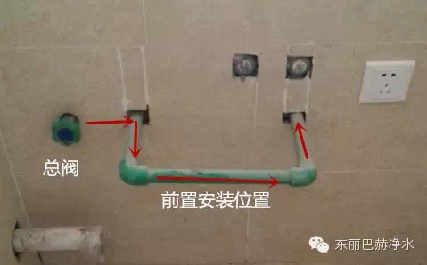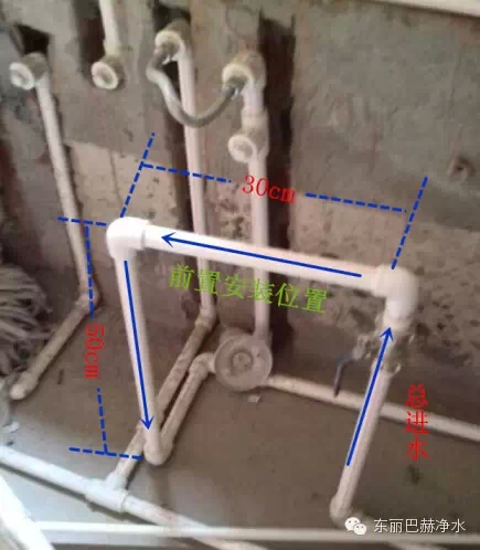 东丽巴赫单个前置过滤器交底: 前置过滤器安装在家里总进水处,一般位置选择在台盆下面最佳,把总水管拉到台盆下面,如图在进水前端加阀门,然后管子焊接成一个U字形出墙外,高50cm、宽30cm、深15-20cm左右,注意预留下水排污。如果是全自动前置则再预留一个电源(特殊情况可预留在管道井内)
