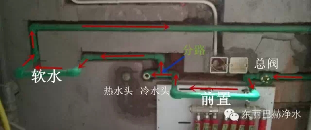 最右侧下方有个总阀,为总进水,管路的水流方向是从右到左,锅炉分水器上方的U型水管(前置)是安装前置的位置,与之连通的冷水头丝口是预留的厨房的饮用水端口。三通分路过后的另一路水是送到软水机的,最左边的U行水管(软水)就是软水机的位置,保证喝的水不经过软水。