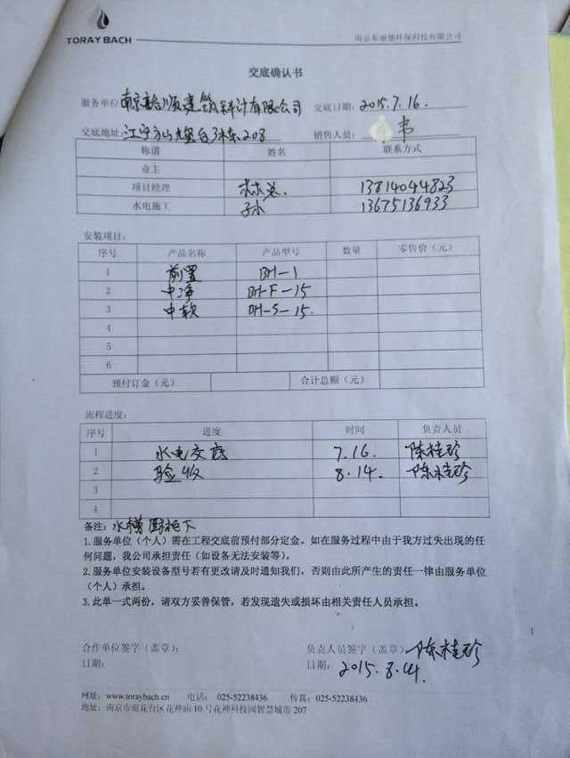 3. 规范服务制度。服务内容涉及哪些项目,服务时间收费标准,由哪些服务人员提供服务等多种可能会出现的服务相关问题。 4. 加强非服务人员服务意识。净水器服务工作是和净水器企业所有人员都相关的事情,不能粗略的认为仅和服务部门相关联,造成销售人员和服务人员服务意识的不统一不能协调做好服务工作。 通过多年在服务方面的投入,东丽德逐渐建立起来了一套完善的服务体系。 东丽德——交底 交底服务流程: ◆(1)接收交底单,确认交底时间。 ◆(2)初次交底,与业主、设计师确定位置。 ◆(3)与水电工交接,预排管路。 ◆(4)复查合格填写交底确认书告知业主及服务商。 ◆(5)装机器前与橱柜商协调尺寸。 ★注:交底详情请关注微信东丽巴赫公众号(Toraybach)净水东丽巴赫---交底篇 ![]()