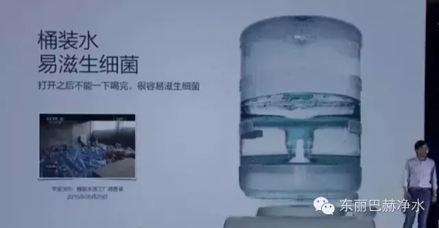 3、桶装水的不安全性: 或许有人会说,我家里安装了饮水机,在使用桶装水喝水,其实桶装水也存在二次污染,尤其是在不能保证桶装水来源的情况下,部分的桶装水生产甚至是使用自来水来灌装,水质根本就没有保证。东丽巴赫水博士提醒您:在桶装水开封后的使用中,如果不及时的将水用尽,空气中的灰尘和细菌也会随着气泡污染水质,造成水质恶化,有的内壁还长了青苔。和桶装水配套使用的饮水机长期不经行清洗的话,加热罐内污秽不堪,饮水水质难以得到保证。