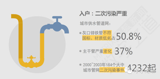 作为自来水入户的“最后一公里”,管网对自来水的安全同样有很大的影响。住建部在曾调查数百城市的供水管网,发现管网质量普遍低劣,已不符国标的灰口铸铁管占50.80%,普通水泥管占13%,镀锌管等占6%。这三类低质管网主要铺设于上世纪70年代至2000年之间。目前,全国仍有大量使用服务期限超过50年和材质落后的管网,导致管网水质合格率较出厂水降低;同时管道的漏损情况严重,“爆管”现象频发,甚至引起全城停水。