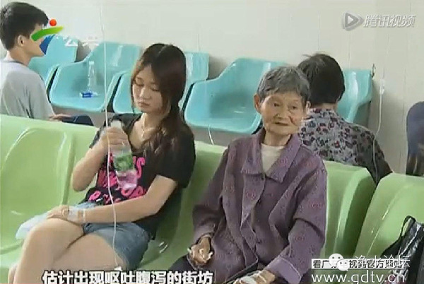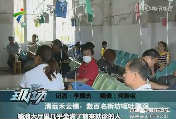 24日早上,清远禾云镇卫生所被几百名前来投医的街坊挤爆,他们症状清一色呕吐腹泻。输液大厅几乎坐满了前来就诊的人,地上还不时能看到他们的呕吐物。