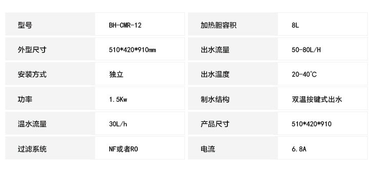 型号:BH-CMR-12 产品优势: 采用国际领先NF纳滤过滤技术,过滤水质符合上海市中小学直饮水标准