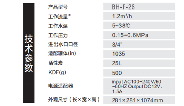 型号:BH-F-26 滤料:KDF高科技滤料,有效去除余氯及铁、猛等重金属 产品优势: 全自动反冲洗设置,采用食品级椰壳活性炭,提供全屋净水